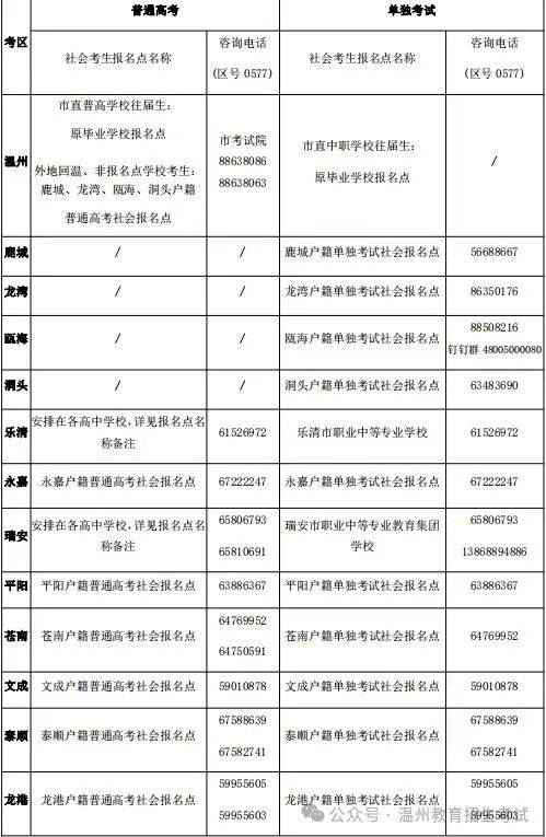 温州市各考区高考社会考生报名点名称及咨询电话