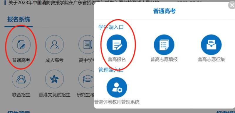 1、在报名系统菜单,点击普通高考,在学生端入口,点击普高报名