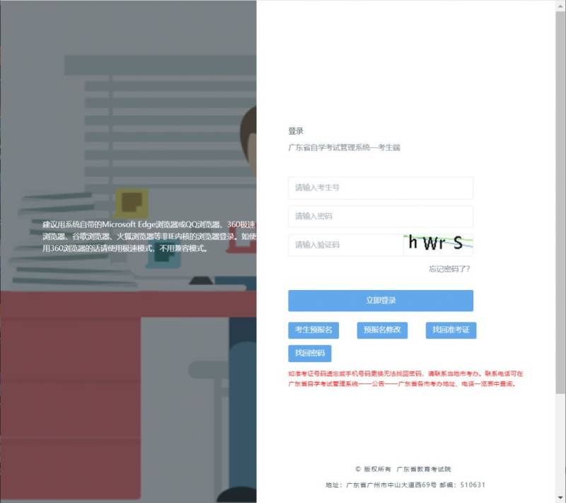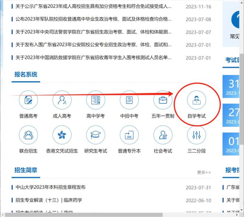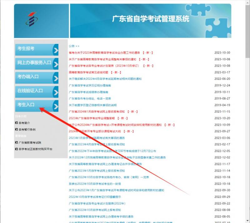 2、在广东省自学考试管理系统点击左侧的考生入口,进入广东省自学考试管理系统—考生端,登录后就可以开始报名