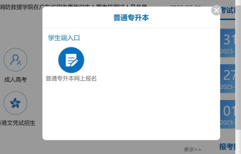 点击报名系统上的普通专升本,然后在学生端入口点击普通专升本网上报名,就可以进入普通高校专升本的报名系统
