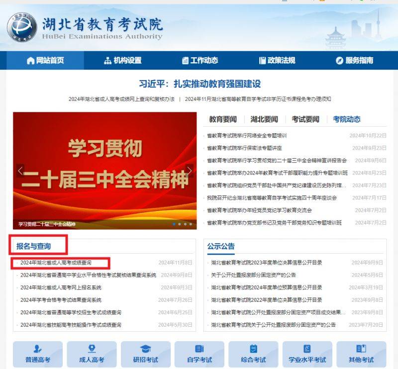 打开湖北省教育考试院官网,下滑点击“报名与查询”;
