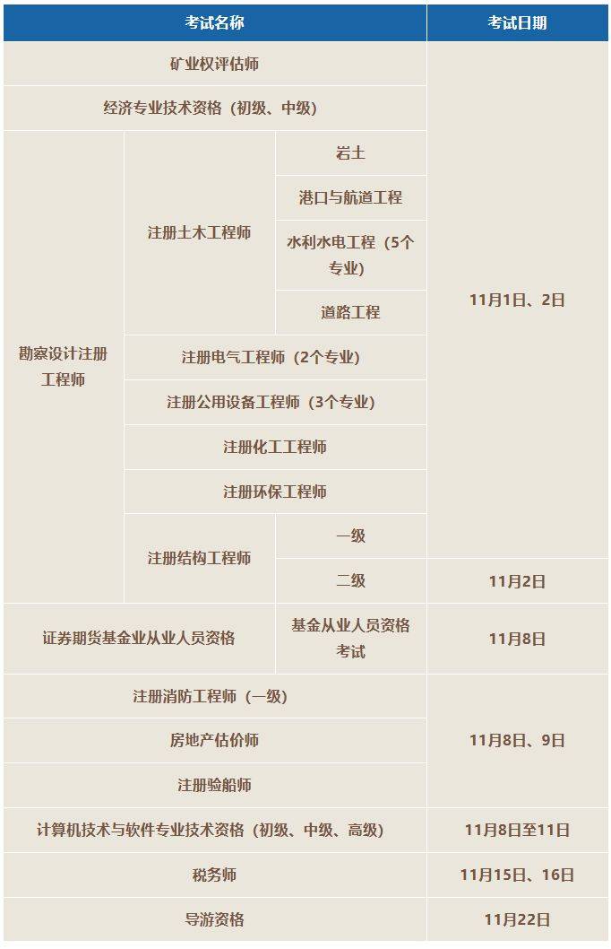 根据住房和城乡建设部执业资格注册中心、人力资源和社会保障部人事考试中心《关于2025年度全国勘察设计注册工程师执业资格考试考务工作的通知》(建注[2025]18号)文件,2025年度全国勘察设计注册工程师执业资格考试定于11月1日、2日举行,其中基础考试为1日,专业考试为1日、2日,考试地点设在各设区市。详细安排请见勘察设计注册工程师报名文件中的附件1。
