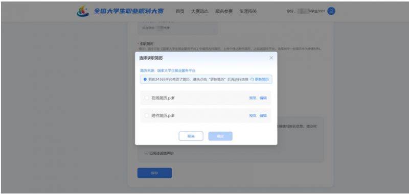 2.就业赛道参赛选手提交参赛材料时,在“求职简历”步骤需前 往【国家大学生就业服务平台】完善简历信息,才可进行简历上传。
