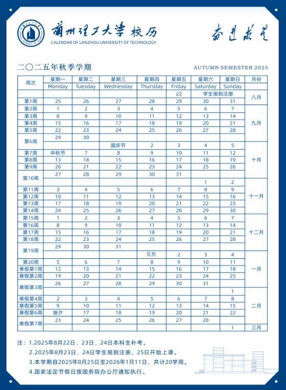 2.2025年8月23日、24日学生报到注册,25日开始上课。