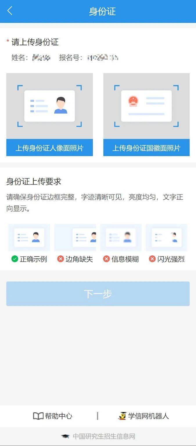 (1)证件类型为身份证但身份核验未通过的考生,须上传本人有效期内的二代居民身份证原件正反面照片。请确保身份证边框完整,字迹清晰,亮度均匀。