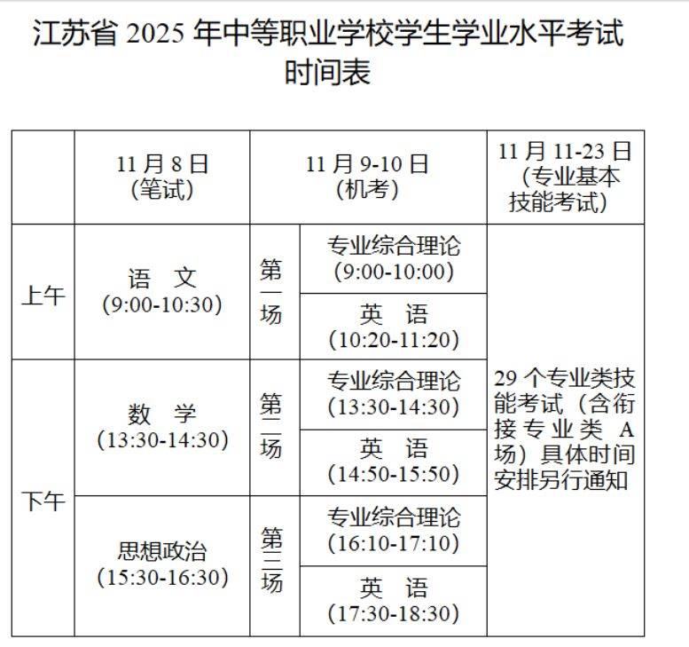 2025年中职学考的报名时间为2025年9月,考试时间为2025年11月。考试具体时间安排详见《江苏省2025年中等职业学校学生学业水平考试时间表》(见附件3)。