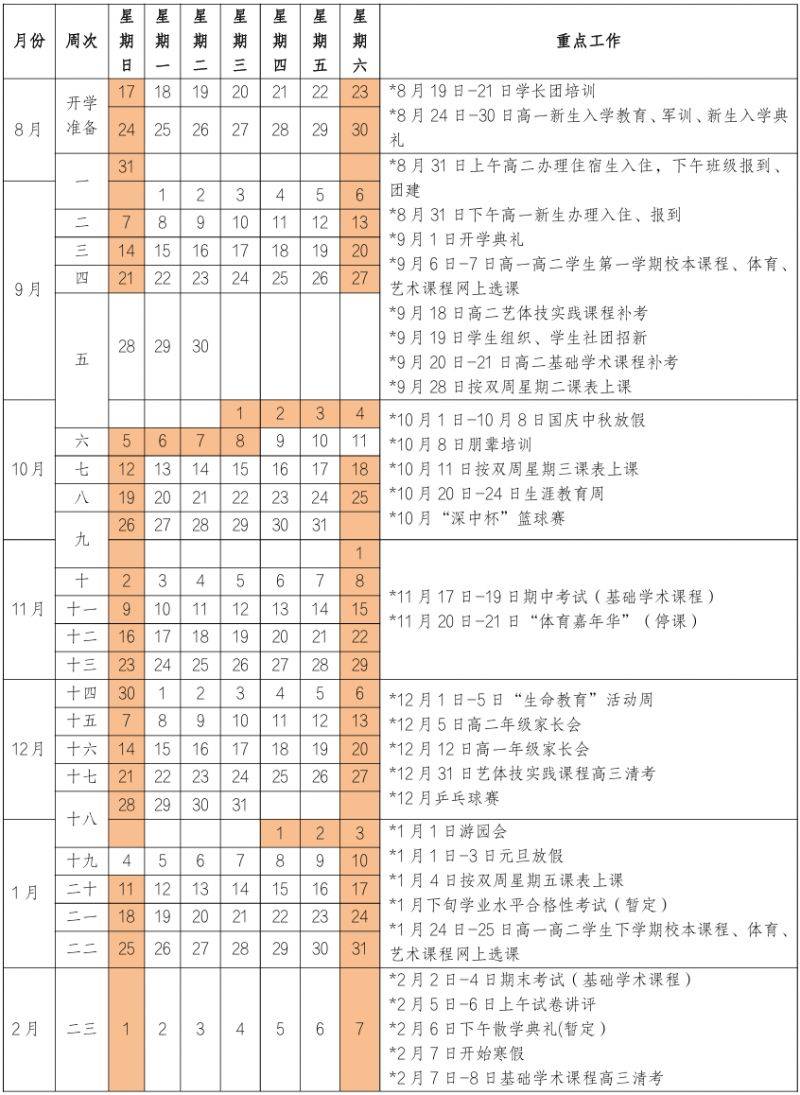 本篇文章给大家分享深圳中学2025-2026学年度第一学期(高中部新校区)的校历,学期从2025年8月开始,至2026年2月结束,涵盖了开学准备、重要活动和假期安排