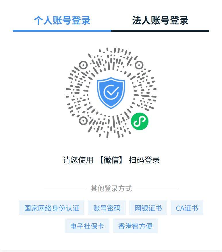 进入登录页面,如下图所示,可用“个人扫码登录”(首次登记需要实名注册并实名验证)或“账号密码登录”。