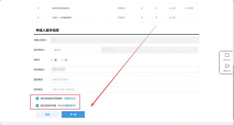 拉到页面下方勾选“我已经阅读并同意遵守《服务协议》”“我已阅读并同意《申办知情同意书》”然后点击“下一步”,如下图所示。