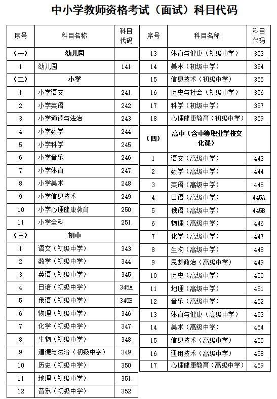 初中面试科目与笔试报考科目三(学科知识与教学能力)相一致,分18个科目:语文、数学、英语、物理、化学、生物、道德与法治、历史、地理、体育与健康、音乐、美术、信息技术、历史与社会、科学、心理健康教育(新增)、日语(新增)、俄语(新增)。