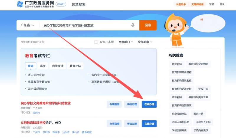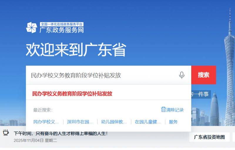打开广东政务服务网之后,在搜索框直接搜索【民办学校义务教育阶段学位补贴发放】