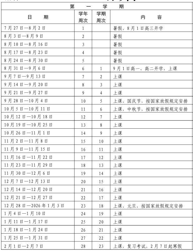 2025-2026学年第一学期第1周为2025年8月31日至9月6日,高一、高二年级开学时间为9月1日,高三年级开学时间为8月1日;第二学期第1周为2026年3月1日至3月7日,开学时间为3月2日。