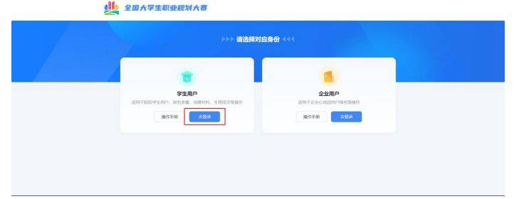 1.在全国大学生职业规划大赛(以下简称“职规赛”)官网首页处,点击“报名参赛”或“登录”进入登录页面。