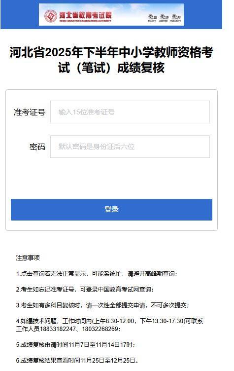 根据有关规定,河北省教育考试院汇总成绩复核信息后报送教育部教育考试院统一复核,复核时仅复核登记分数是否准确。若考生因成绩复核延误了面试报名,教育部教育考试院将为考生开放面试补报名通道。请考生准确填写成绩复核申请相关信息,并在规定时间内提交复核申请。未按规定时间和方式提出复核申请或提供的信息存在差错导致无法进行成绩复核的,责任由考生本人承担。