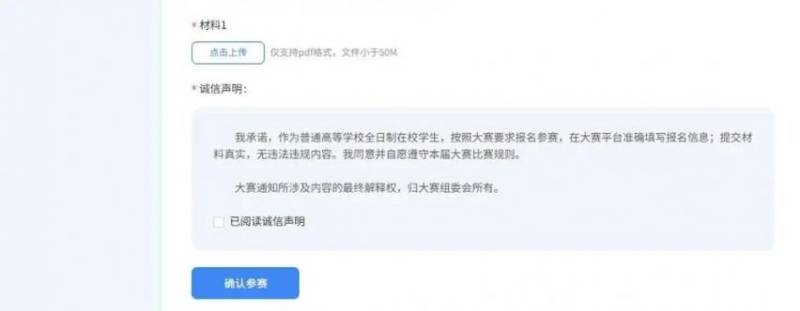(7)阅读并勾选“诚信声明”后,点击“确认参赛”即完成报名。完成报名后,请等待校级管理员审核。