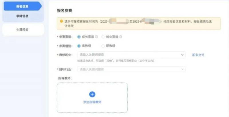 (4)选择成长赛道(面向本科一至三年级学生)和高教组,其中“指导老师”板块必须填写(导师一经填报不可更改),可填班主任、学业导师、辅导员、学院副书记等。