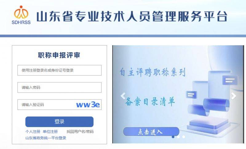 (2)注册成功后重新返回山东省专业技术人员管理服务平台首页,点击首页登录框中【山东省政务统一用户平台】蓝色链接,使用注册的账号进行登录。