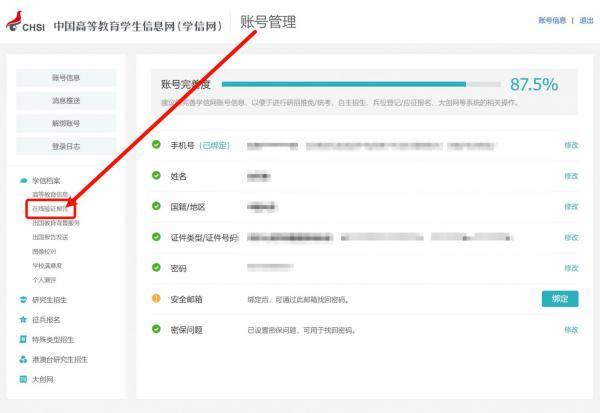 第三步:登录成功后,进入“账号管理”页面,选择“学信档案”——“在线验证报告”;
