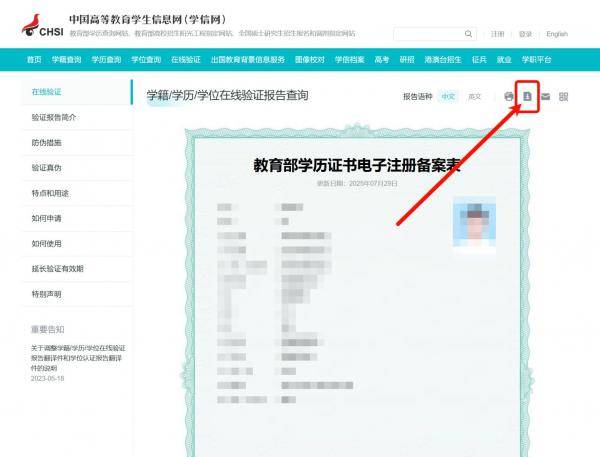 第六步:电子注册备案表更新完成,点击右上角下载标记,选择下载报告,可获得《教育部学历证书电子注册备案表》PDF文件。