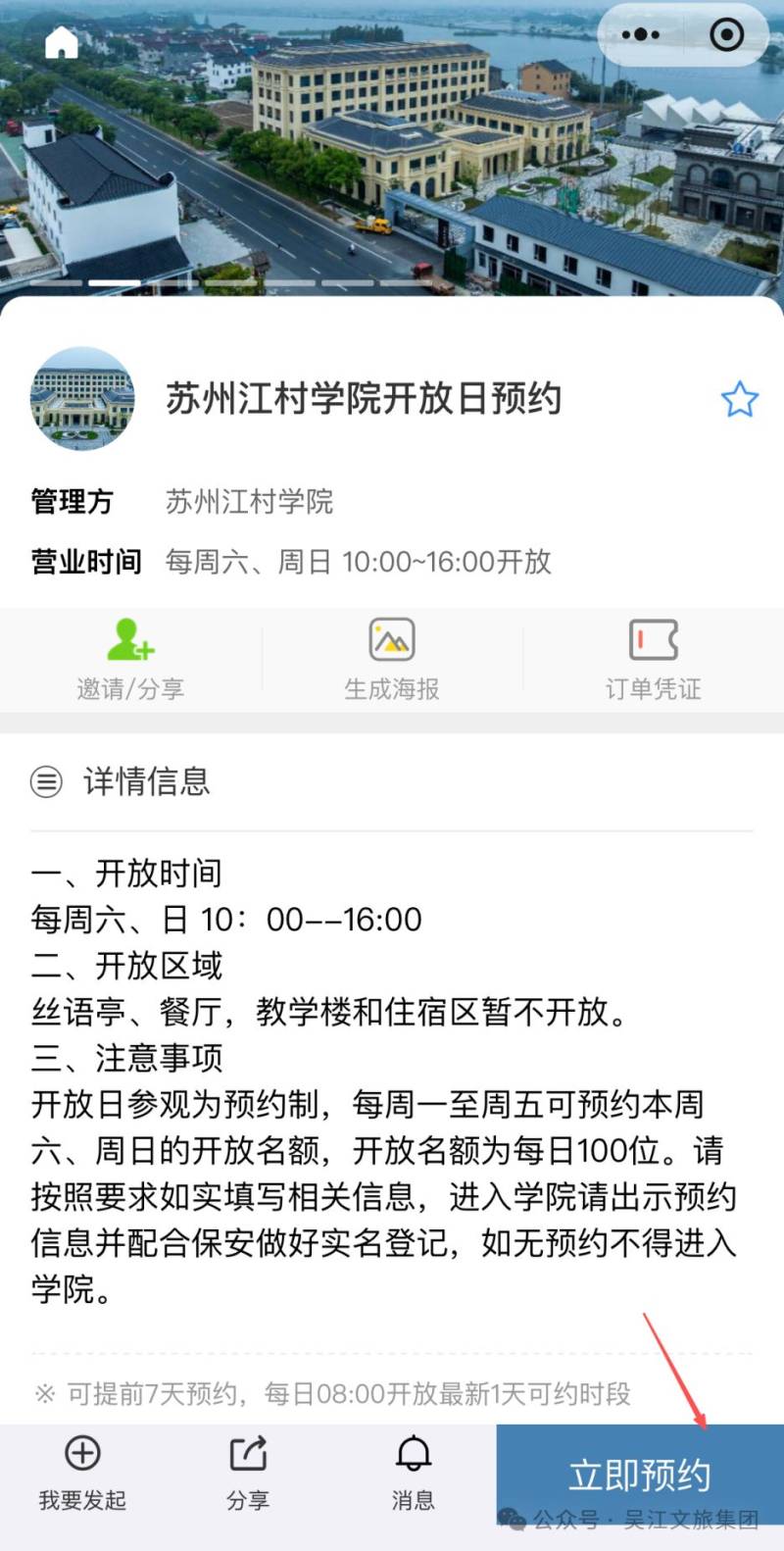 或关注“苏州江村学院”公众号查看详情页点击“我的学院”→“开放日预约”