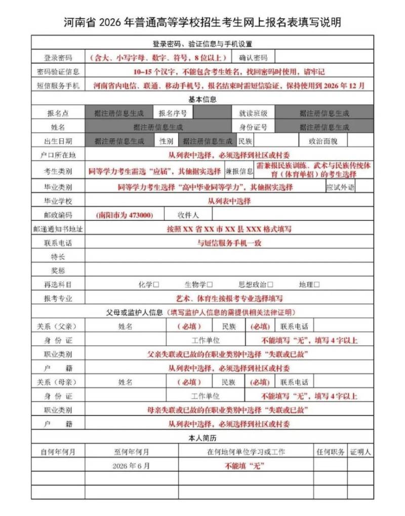 5.短信服务手机。主要为考生提供安全服务、信息服务,用于“河南省普通高校招生考生服务平台”登录提醒、重置密码验证、填报志愿确认、放弃志愿等。省教育考试院将通过10639639公益短信平台向填写手机号码的考生发送免费短信。为确保考生正常获得以上服务,此号码仅限填写河南省内的中国电信、中国联通或者中国移动手机号码,并确保从报名到录取期间此号码持续有效。考生或者考生监护人应为此号码的注册使用人,以免手机丢失无法补办。同一手机号码只能由一名考生注册使用。考生注册后手机号如有变更,应及时在“河南省普通高校招生考生服务平台”进行变更。