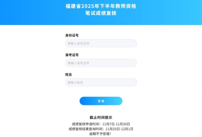 福建省2025年下半年教师资格笔试成绩复核(http://125.77.73.40:81/h5/#/pages/login?id=737626055020549)