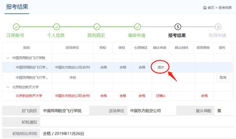 当考生所填报申请组合的初检、体检、心理测试都合格后,进入确认有效招飞申请阶段,在此阶段考生可以选择至多2个合格的申请组合,申请由送培单位对考生进行背景调查。背景调查合格的申请组合,正式成为考生在招飞系统上的有效招飞申请。