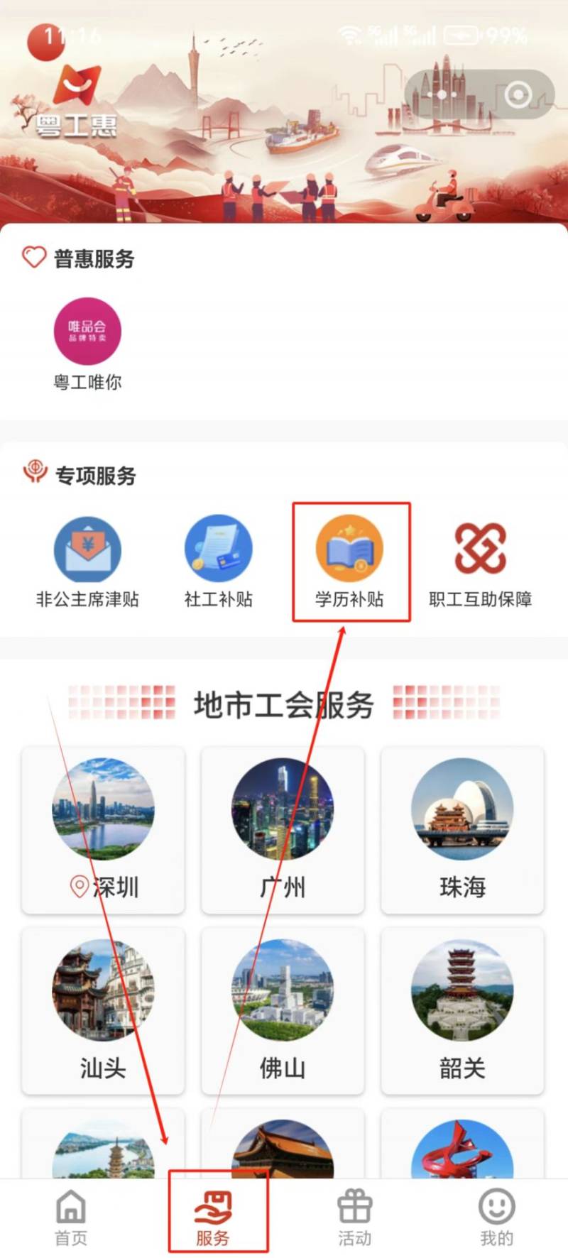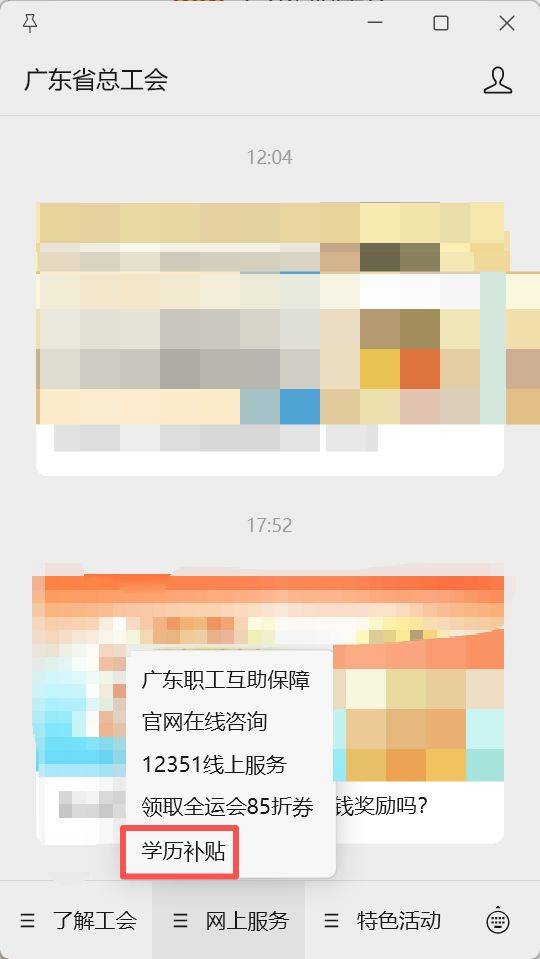通过「广东省总工会」官方微信公众号菜单栏进入「学历补贴」申请页面。