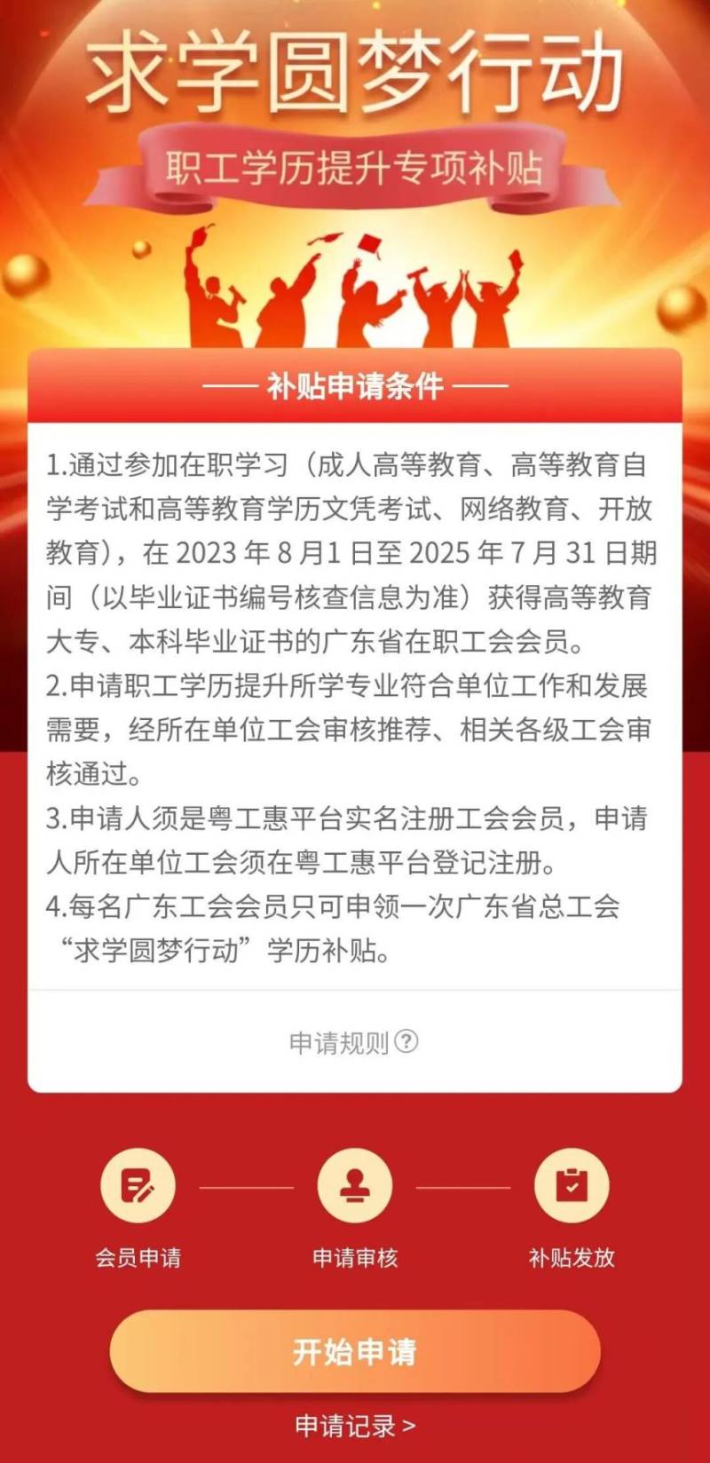 第一步:11月6日10时—11月19日22时期间,符合条件的一线职工,使用本人实名认证微信,进入“粤工惠”小程序「学历补贴」申请页面