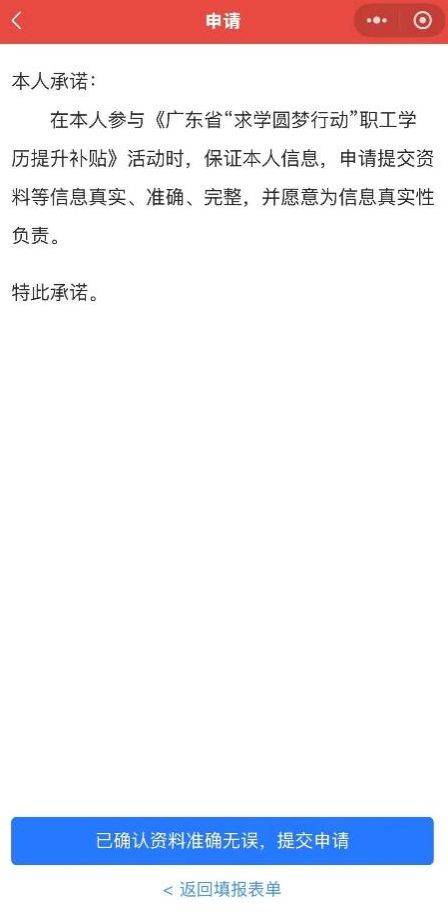 第二步:进入学历补贴申请页面后,点击「开始申请」,进入申请页面完成申请信息填写并阅读同意承诺书及上传图片。