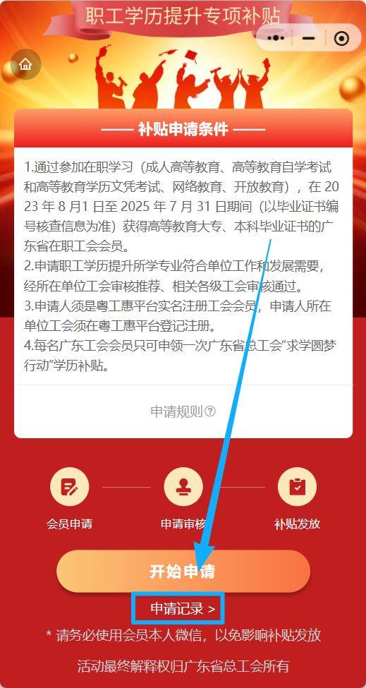 在粤工惠微信小程序的「学历补贴」页面-「申请记录」中查看广东总工会职工学历补贴的审核进度,用户提交申请后,最终审核通过或驳回系统也将发送微信消息通知提醒,敬请留意。