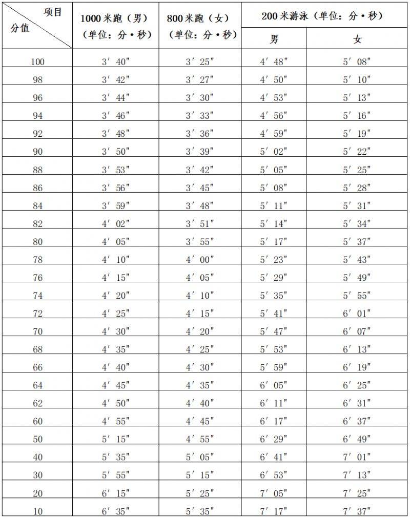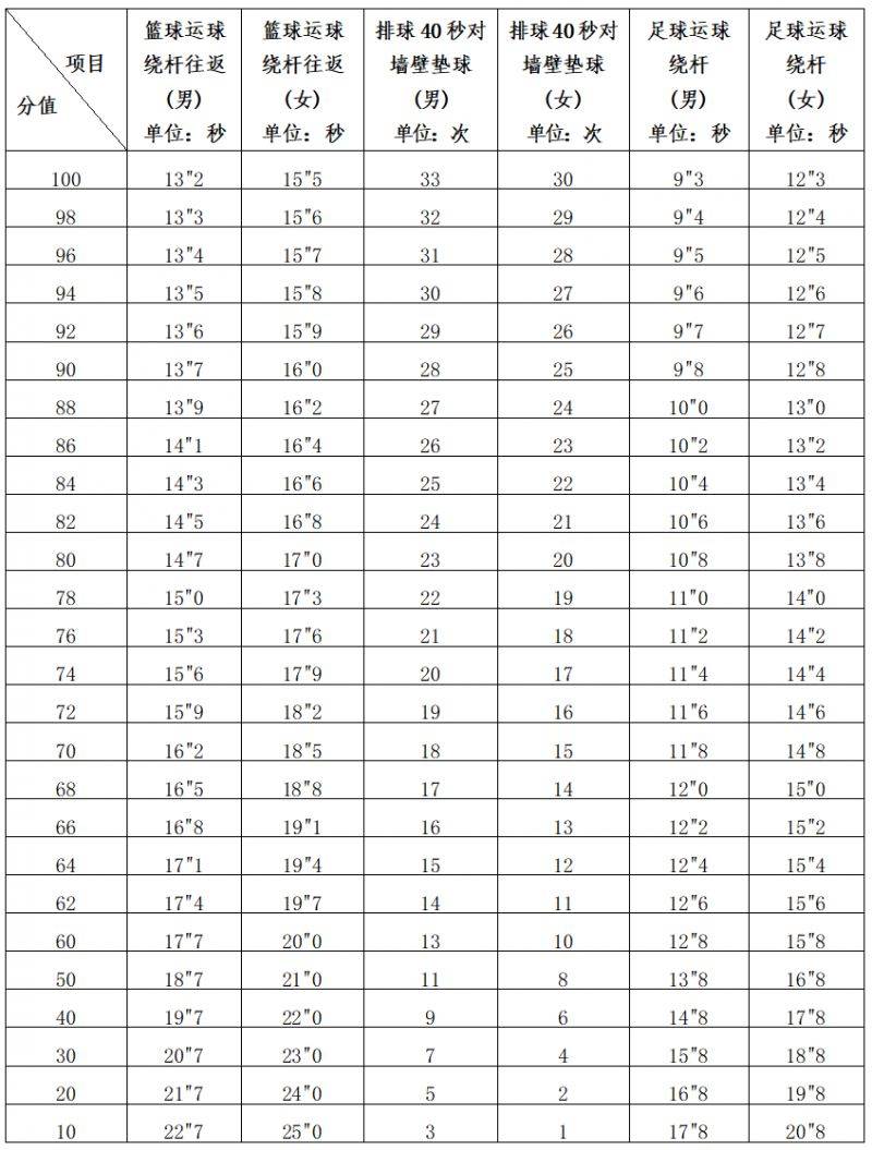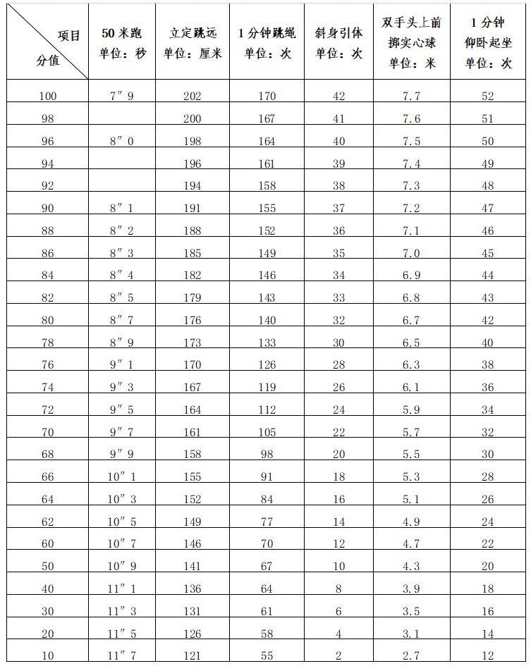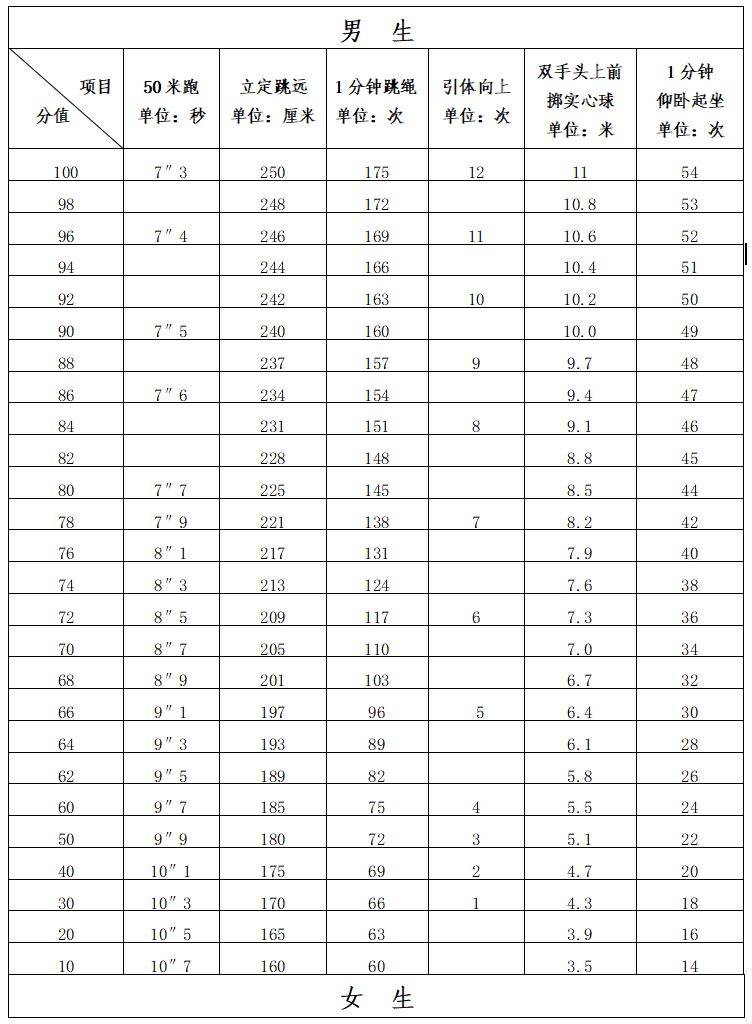 福建省初中毕业升学体育与健康考试身体素质与运动技能测试评分标准