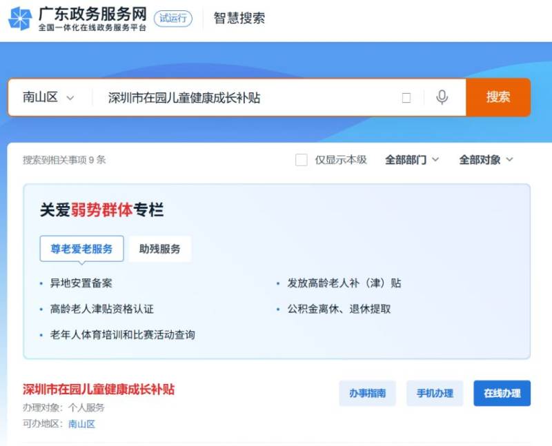 3、进入南山区服务页面,在搜索栏输入【深圳市在园儿童健康成长补贴】,并点击搜索按钮,进入事项申报页面。