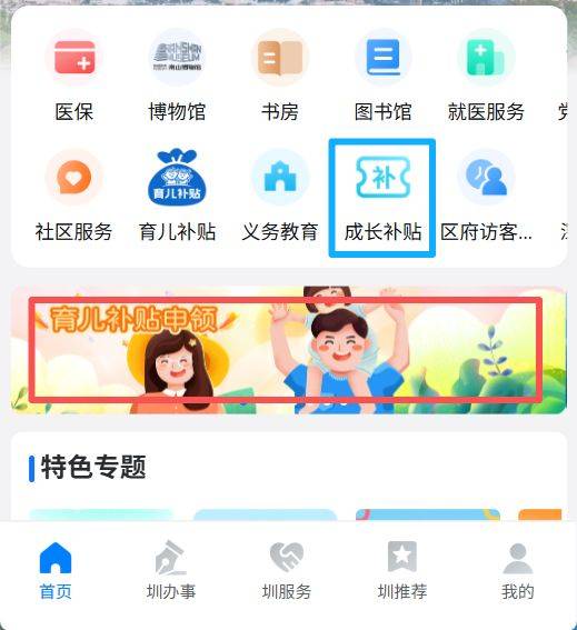 2、到首页后,找到并点击成长补贴