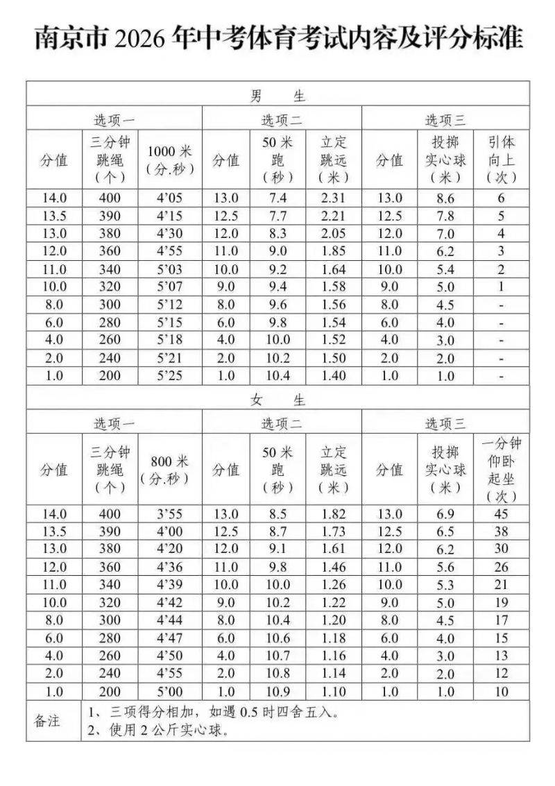 南京市中考体育考试采取选项办法,考生在三类选项中各选择一个项目测试,三项满分为40分,计入升学总分。