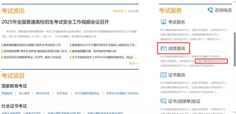 第一步:进入中国教育考试网,页面右侧【成绩查询】中点击【全国计算机等级考试】;