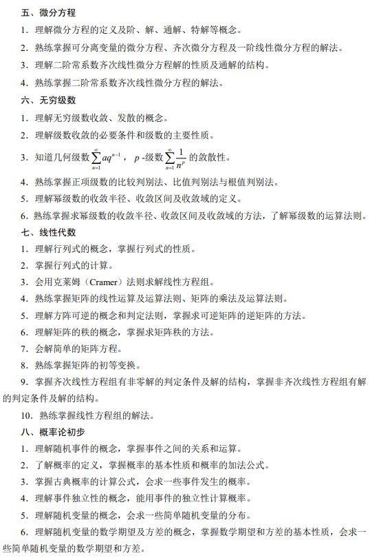 考试内容:一元函数微分学、一元函数积分学、向量代数与空间解析几何、多元函数微积分学、微分方程、无穷级数、线性代数、概率论初步。