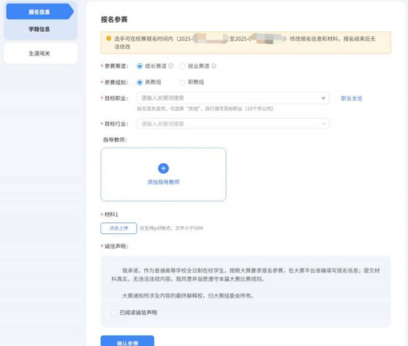 2.填写报名信息时,依次选择参赛的赛道组别,填写本人目标职业、目标行业,上传校赛参赛材料,阅读并勾选“诚信声明”,点击“确认参赛”按钮即可完成报名。