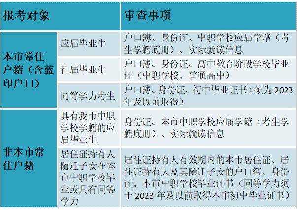 (2)具有本市常住户籍的普通中专、职业高中、技工学校(以下简称“中职学校”)毕业生、普通高中往届毕业生、同等学力考生;具有本市中职学校正式学籍的应届毕业生;在本市中职学校毕业或具有同等学力的本市居住证持有人随迁子女。