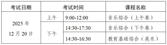 1.《音乐综合》《教育基础综合(美术)》由全省统一安排,具体时间为: