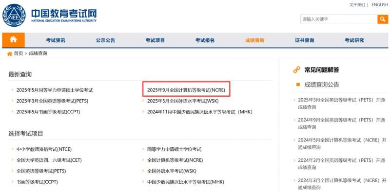 中国教育考试网官网(https://www.neea.edu.cn/)已经在成绩查询界面更新了2025年计算机9月成绩查询入口