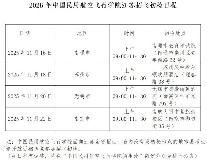 2026年中国民用航空飞行学院(以下简称中飞院)招飞工作已全面开始,中飞院决定于2025年11月16日-11月22日在江苏省进行招飞初选工作,现将具体事宜通知如下: