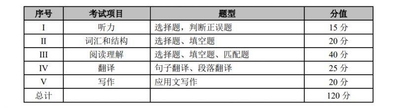 考试项目:听力、词汇与结构、阅读理解、翻译、写作。