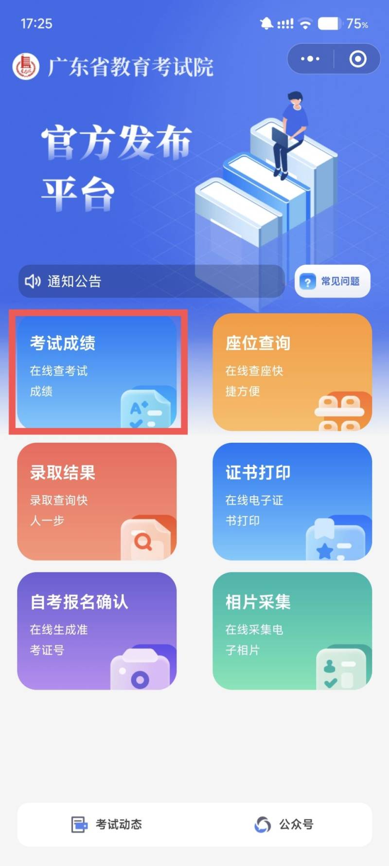 考生关注广东省教育考试院官方微信(ID:gdsksy),在页面底部选择“小程序”栏,点击进入“广东省教育考试院”小程序,按栏目指引,通过考生号和密码登录即可查询。