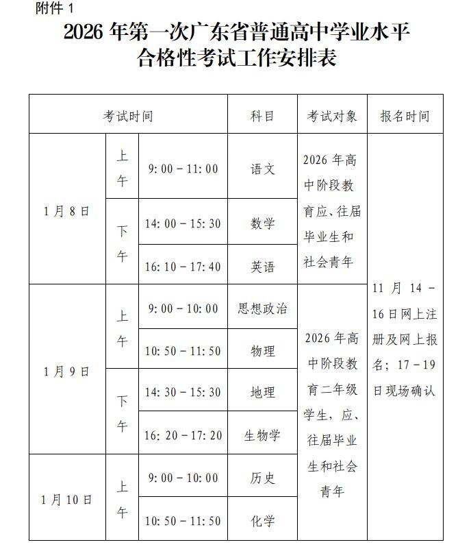 2026年第一次合格性考试科目为语文、数学、英语、思想政治、物理、历史、地理、化学和生物学等9门