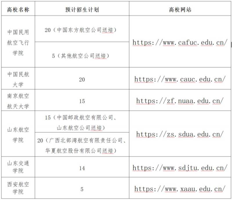 山东省2026年普通高等学校招收民航飞行技术专业各招生高校预计招生计划及网站