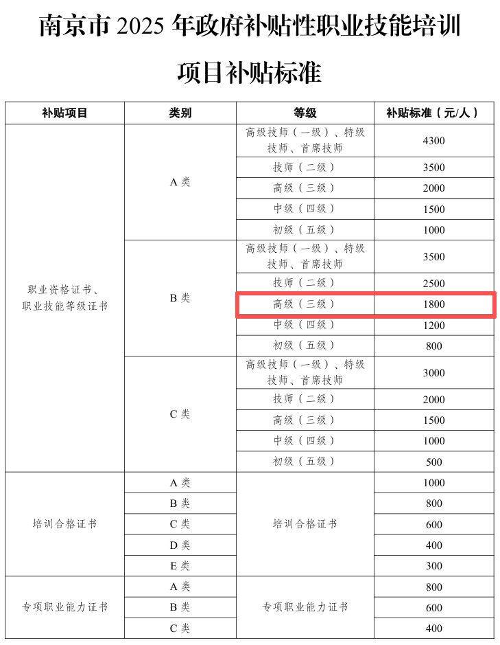 纳入《南京市2025年高技能人才培训补贴紧缺型职业(工种)目录》的职业(工种)补贴标准在同类型一般职业(工种)补贴标准上提高30%。