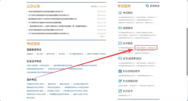 第一步:进入中国教育考试网(www.neea.edu.cn),在右侧找到证书查询,点击全国大学英语四、六级考试(CET)