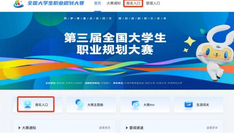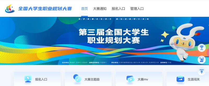 1.在全国大学生职业规划大赛(以下简称“职规赛”)官网(网址:https://zgs.chsi.com.cn/)的首页处,点