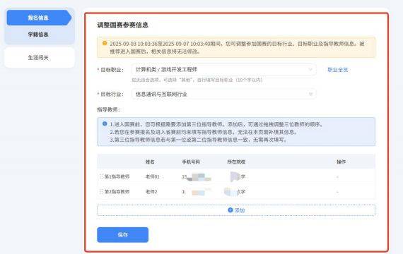 1.当学校通知相关选手可调整国赛参赛信息且省级管理员开放选手调整国赛参赛信息功能后,选手可在“个人中心-报名信息”页面点击“调整国赛参赛信息”按钮进入对应编辑页面,按要求添加“指导教师”,根据需要可拖动调换 1-3 指导教师顺序,对“目标职业”、“目标行业”信息进行调整,完成后点击“保存”按钮即可。